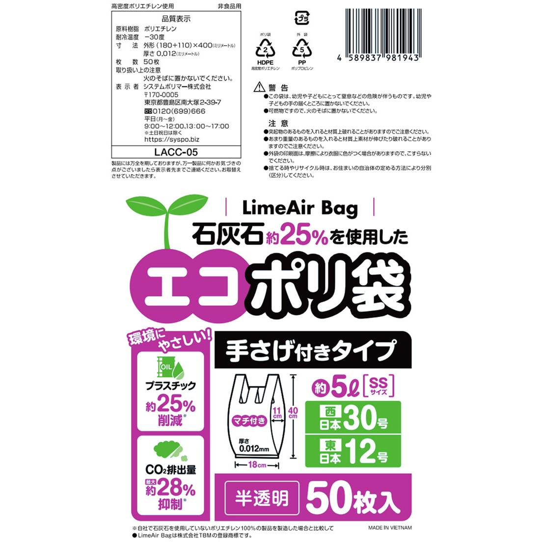 lacc-05 石灰石約25%使用 エコポリ袋 手さげ付きタイプ 半透明 1箱(50枚×60冊) システムポリマー 【通販モノタロウ】